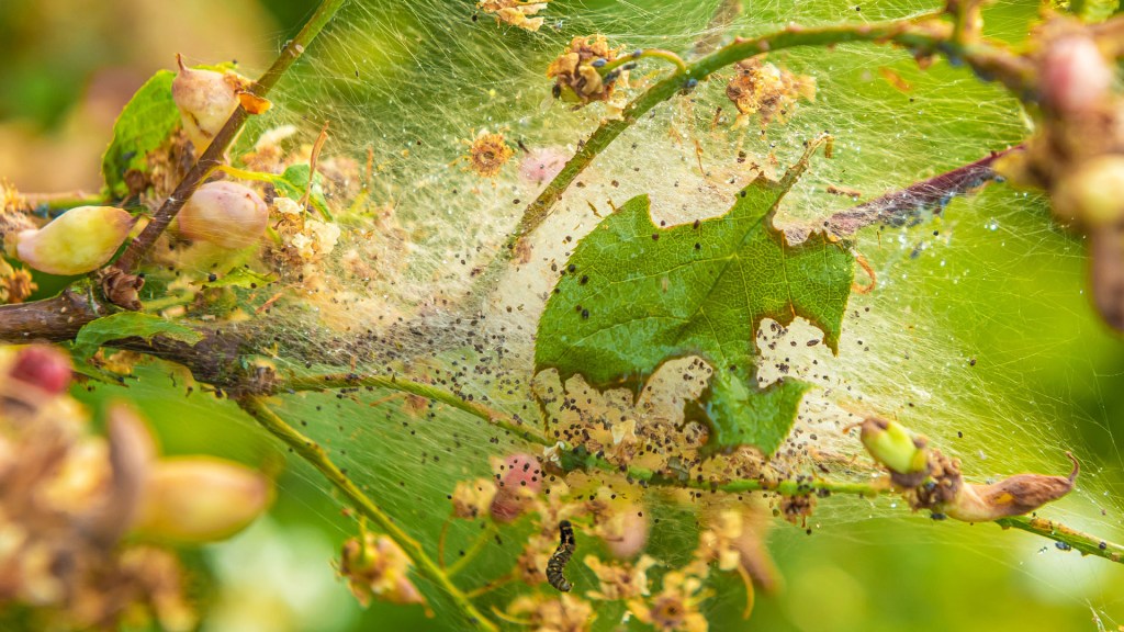This ermine moth caterpillar (centre bottom) is busy feeding on the leaf as it weaves a web in which it will shortly pupate and, by the end of July, emerge as a distinctive white moth.