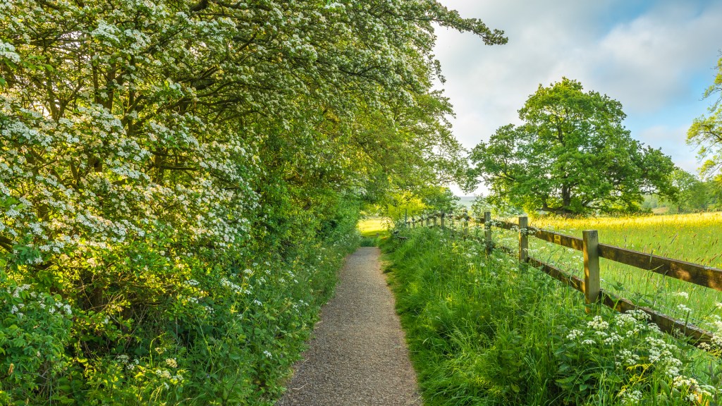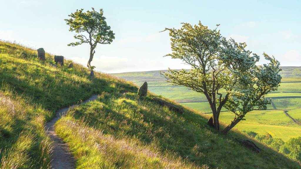 A pair of windswept hawthorn trees in full bloom with May blossom.