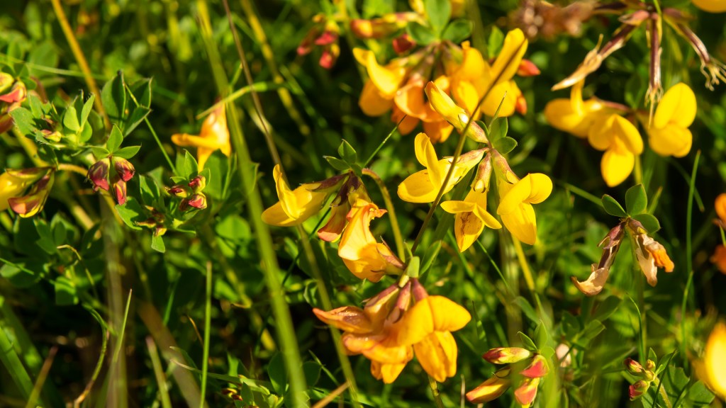The side of the hill is covered with a carpet of birdsfoot trefoil