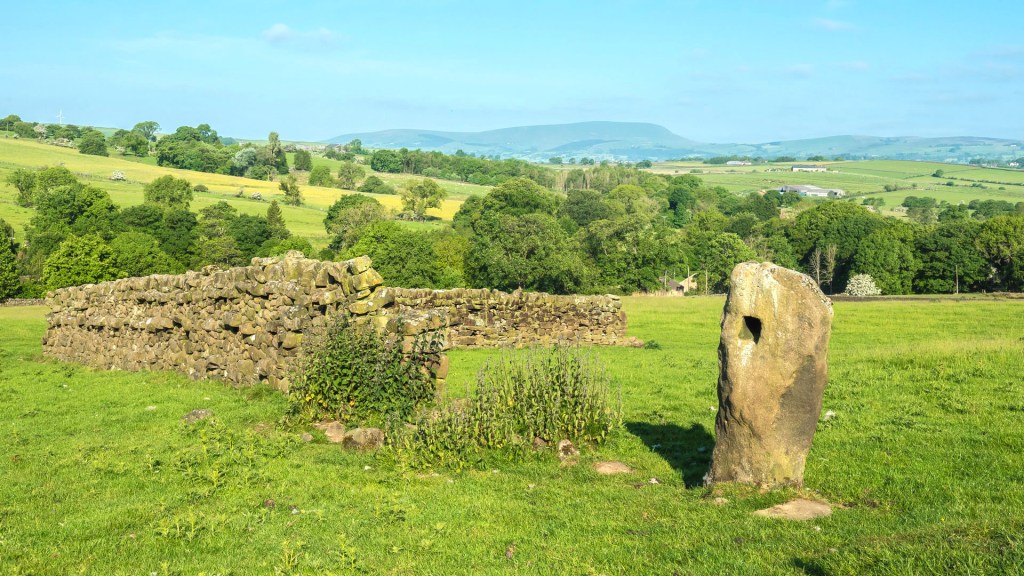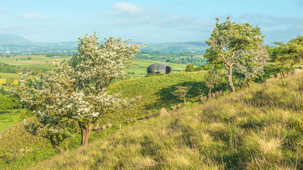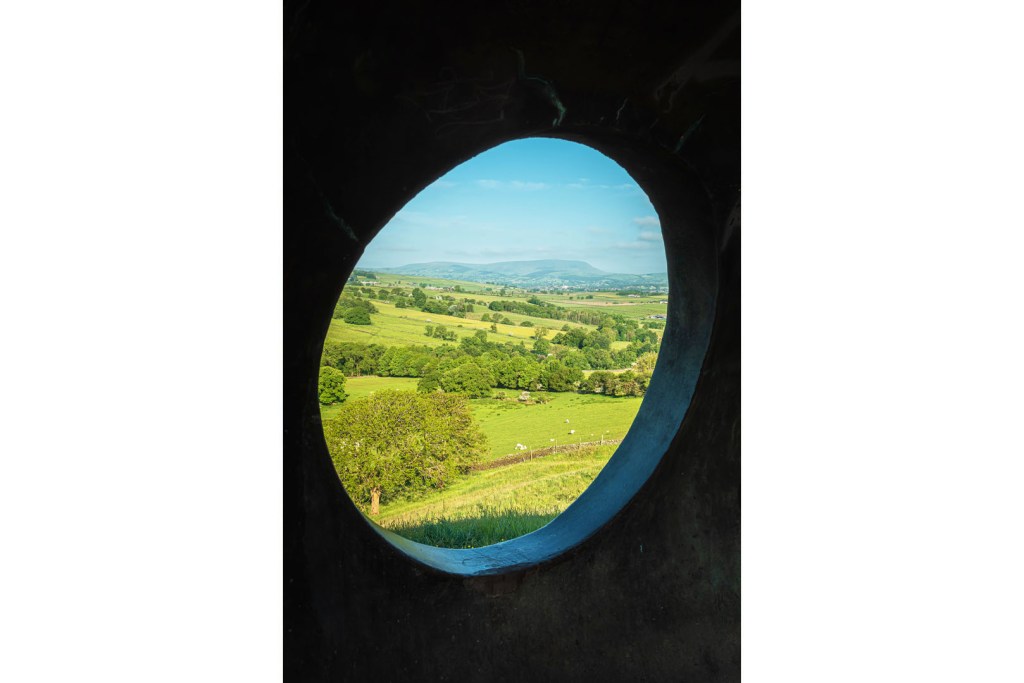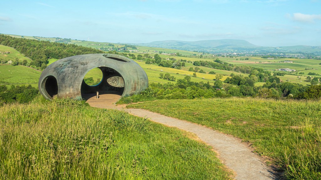 The Atom Panopticon is perched on a hilltop overlooking Wycoller and Pendle Hill. It originally housed a chrome sphere to reflect the various views seen through its ‘windows’ but this was vandalised fairly soon after it was installed and has never been replaced. It’s a great place to stop and admire the view though.