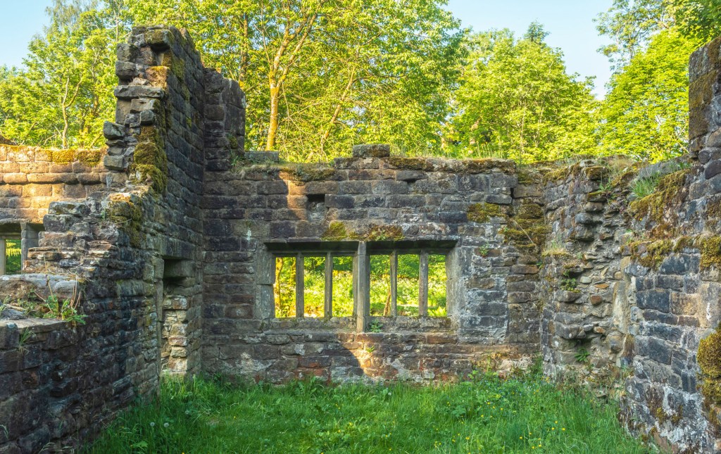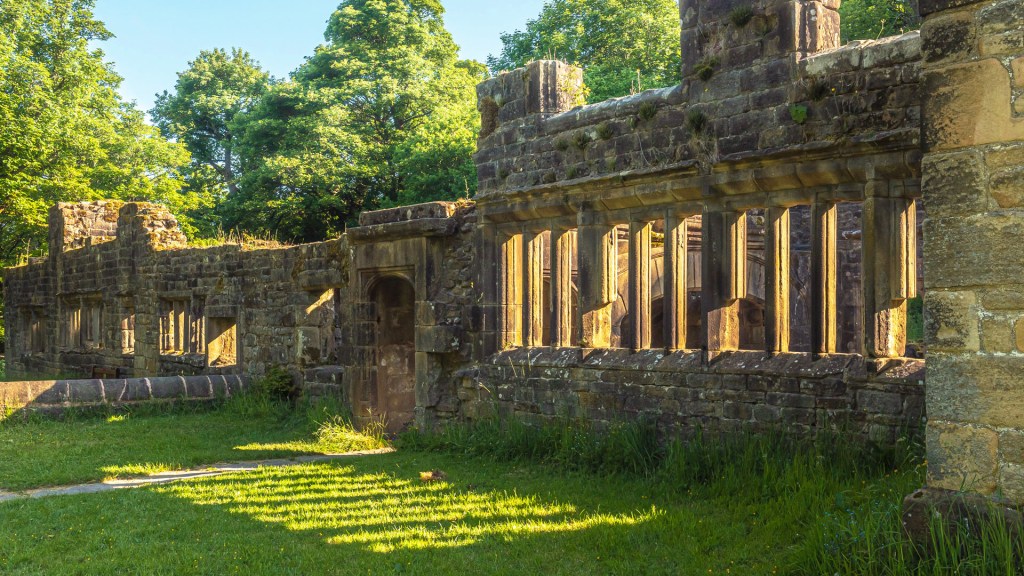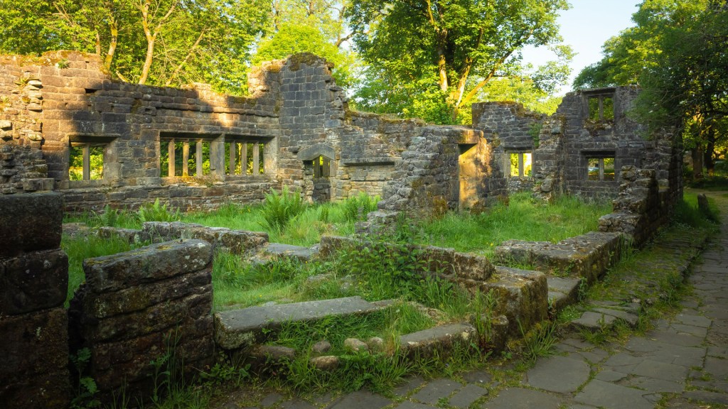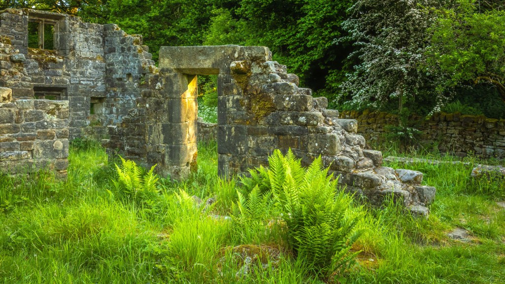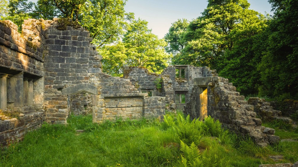 The ruins of Wycoller Hall, the model for Ferndean Manor in Charlotte Brontë’s Jane Eyre. In the book, Jane initially finds the house dark and unwelcoming and feels trapped by the surrounding dense woodland but as she spends more time there with Mr Rochester she begins to feel that it protects them from the outside world.