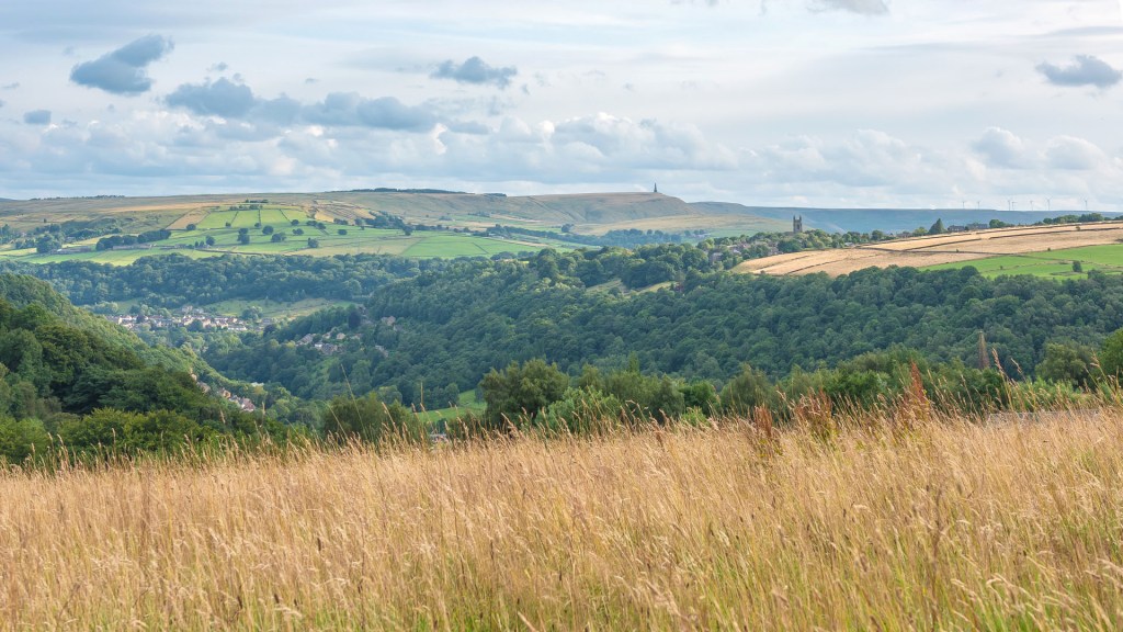 The view over Crimsworth Dean to Heptonstall. Wadsworth War Memorial is just visible in the trees to the right and Stoodley Pike Monument is on the horizon.
