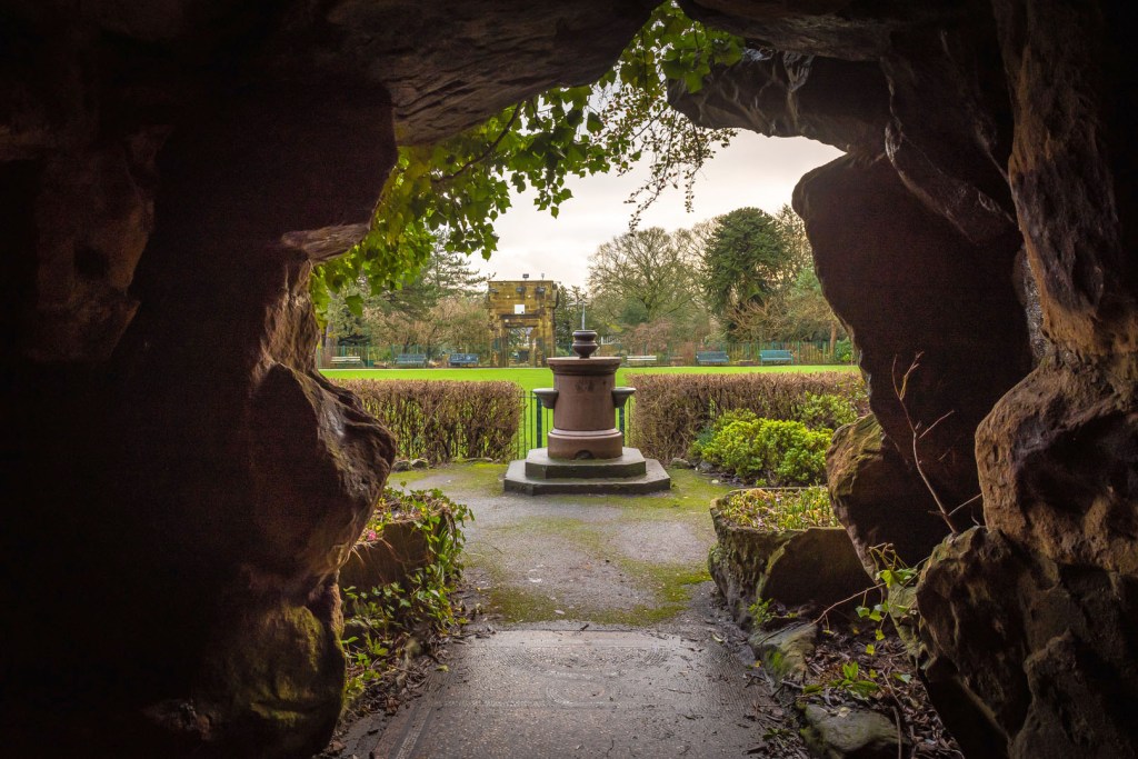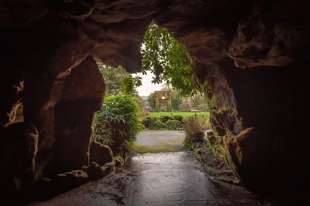 Holden Park is the site of the long-demolished Oakworth House, home of Victorian businessman, inventor and politician, Sir Isaac Holden. This staircase was part of the winter gardens, a series of huge heated glass houses that contained tropical plants, waterfalls and a network of man-made caves and grottoes, such as those below. Most of the hard-landscaping from these glass houses still exists and is fascinating to explore.