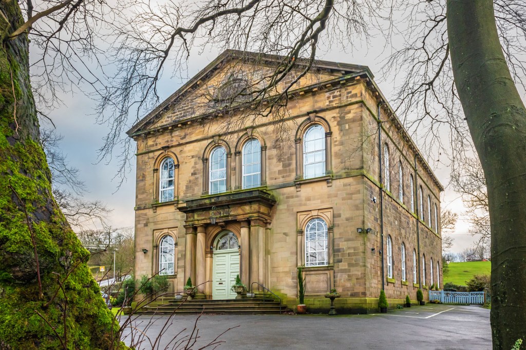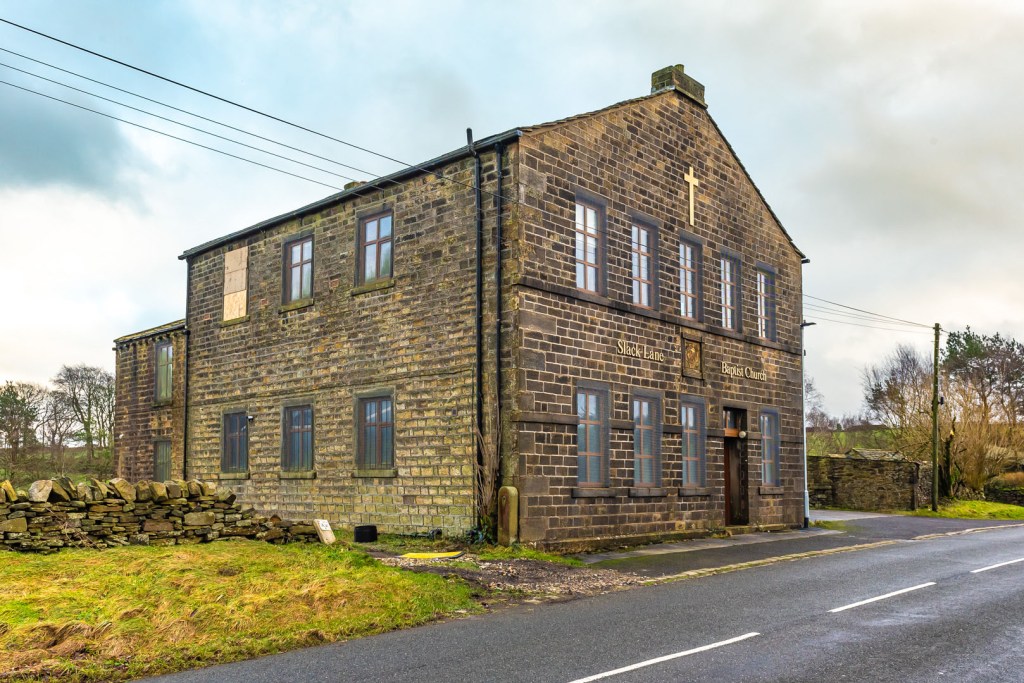 Slack Lane Baptist Chapel, opened in 1880 to replace the old chapel that still stands just down the road (see next photo), is an imposing building in a secluded spot just outside Oakworth. It closed in 2018 and was converted to apartments.